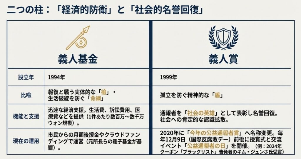 参与連帯は1994年に市民からの寄付に基づく「義人基金」を設立し、告発によって解雇され困窮した通報者に対し、生活費や訴訟費用、医療費などを迅速に支援してきました。これは国の救済金が下りるまでの空白期間を埋める「命綱」として機能しています。
