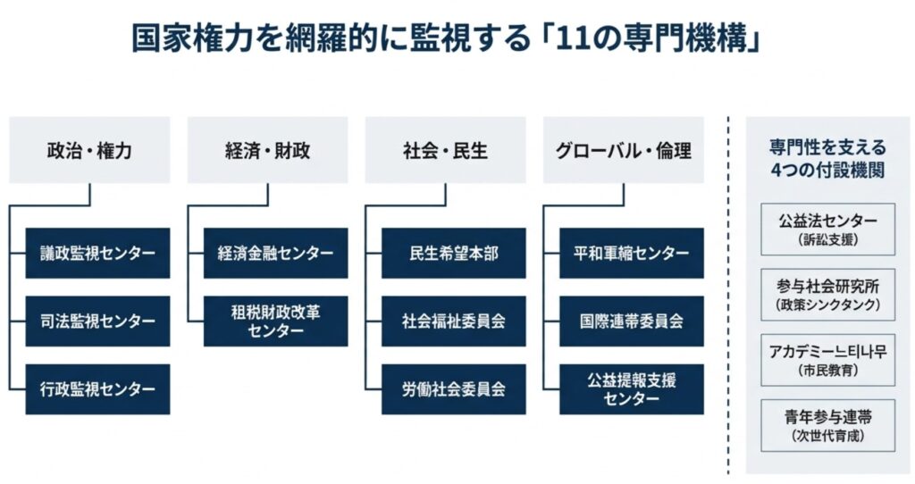 参与連帯は「参与・連帯・監視・対案」の4大活動原則に基づき運営されています。国会を監視する「議政監視センター」、検察や裁判所を監視する「司法監視センター」、財閥を監視する「経済金融センター」など、11の専門的な活動機構を有しています。
