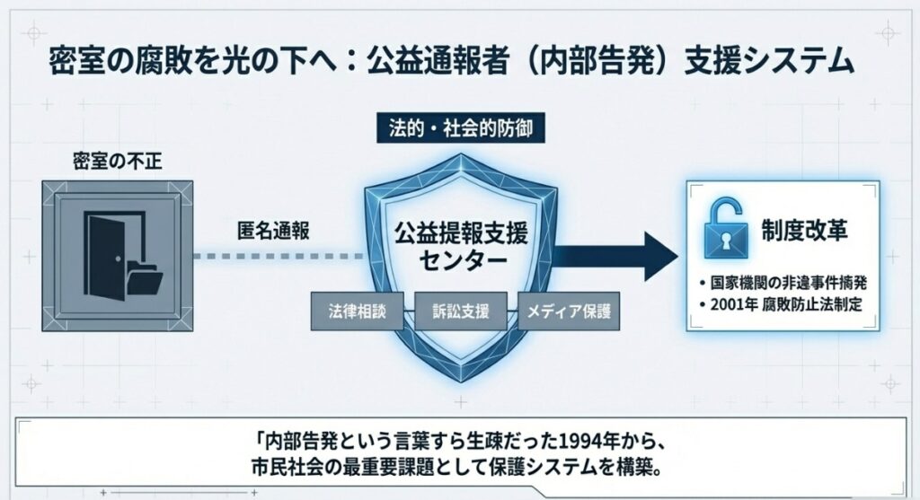 参与連帯の支援活動において特筆すべきは、国家の法制度を補完する独自の支援システムを持っている点です。 公益申告者が最も恐れるのは、経済的な破綻と社会的な孤立です。1990年代初頭の韓国では、軍や政府内部の不正を告発する勇気ある市民が相次いで現れました。しかし、彼らを待っていたのは賞賛ではなく、「組織の裏切り者」という烙印と、即座の解雇、そして法的な報復でした。