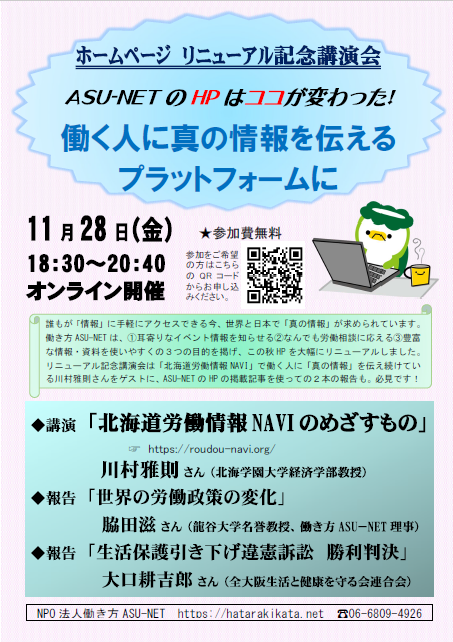 誰もが「情報」に手軽にアクセスできる今、世界と日本で「真の情報」が求められています。 働き方ASU-NETは、①耳寄りなイベント情報を知らせる②なんでも労働相談に応える③豊富な情報・資料を使いやすくの3つの目的を掲げ、この秋HPを大幅にリニューアルしました。 リニューアル記念講演会は「北海道労働情報NAVI」で働く人に「真の情報」を伝え続けている川村雅則さんをゲストに、ASU-NETのHPの掲載記事を使っての2本の報告も。必見です!