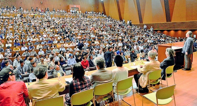 安保関連法案(戦争法案)に反対する運動で大きな力を発揮した学者と学生が協力して25日、東京都千代田区の法政大学薩埵(さった)ホールでシンポジウムを開きました。題して「岐路に立つ日本の立憲主義・民主主義・平和主義―大学人の使命と責任を問い直す」。開場前から100人以上が並び、会場いっぱいの1300人が学者と学生の発言に聞き入りました。